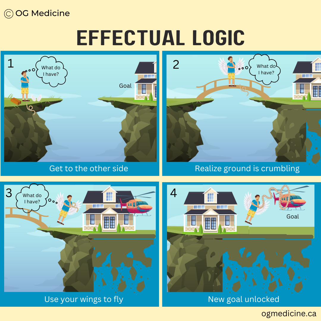 This is the opposite of causal, or what I call control, logic. Control logic is the main mode of thinking taught in many business classes and classic research studies. You’re told to do extensive market research, map the competition, develop a comprehensive go-to-market strategy, etc. Or, in healthcare, engage stakeholders, outline objectives, create detailed plans, apply for funding, etc.